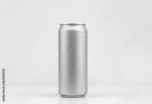 Grey blank carbonated energy drink can mockup with condensation, isolated on light grey background, aluminum, blank
