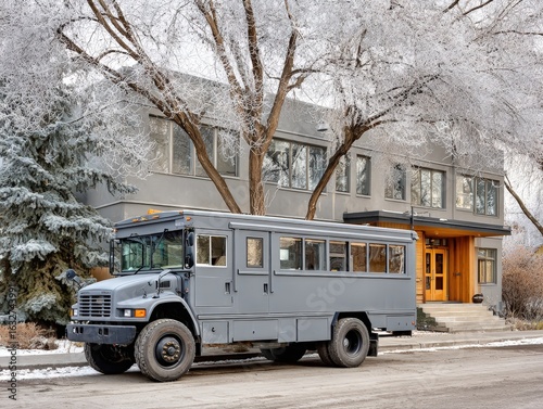Grey Bus Parked in Front of a Modern House on a Snowy Winter Day