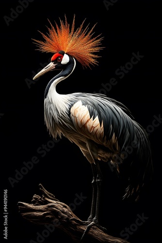 Grey Crowned Crane Bird, Perched on a Branch with Black Background, Photo Realistic, Wallpaper, Cover and Screen for Smartphone, Cell Phone, Computer, Laptop, 9:16 and 16:9 Format
