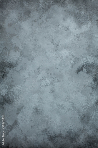 Grey hand-painted concrete background texture with dark and light spots and vignetting