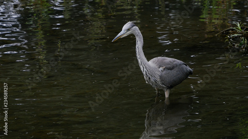 Grey Heron / Ardea cinerea portrait wading in river hunting for fish