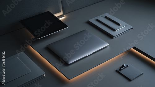 Grey laptop, tablet, notebook, and clipboard on a dark grey surface with subtle warm lighting, showcasing a minimalist workspace concept ideal for technology or business presentations