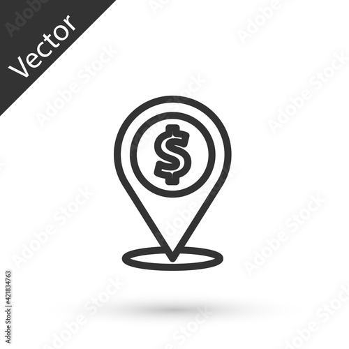 Grey line Cash location pin icon isolated on white background. Pointer and dollar symbol. Money location. Business and investment concept. Vector