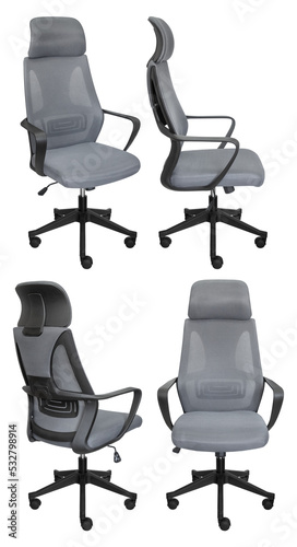 Grey office chair with mesh back. Isolated from the background. View from different sides