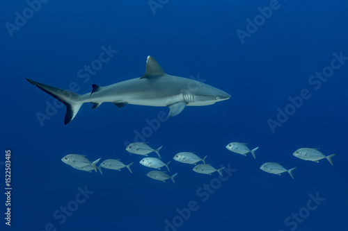 Grey reef shark swimming in crystal blue Maldives waters