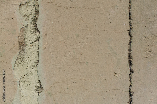 Grey texture of old broken asphalt road or wall big abrasions cracks holes on the surface pebbles cement in Sofia, Bulgaria, Eastern Europe