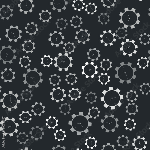 Grey Time Management icon isolated seamless pattern on black background. Clock and gear sign. Productivity symbol. Vector