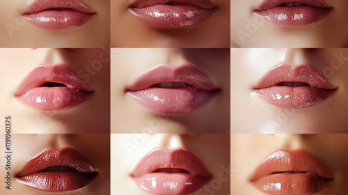 Grid layout of lips, emphasizing soft, natural fullness, smooth glossy pink textures, and dewy lighting with blurred minimal backgrounds.