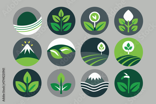 Grid of nature and agriculture themed circular icons