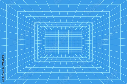 Grid room in perspective, vector illustration in 3d style. Indoor wireframe from blue lines, template interior square, digital empty box. Minimal background design