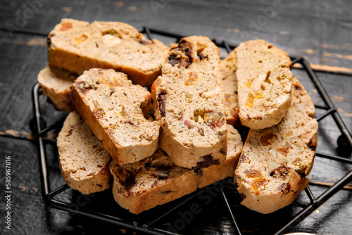 Grid with delicious biscotti cookies on black wooden background