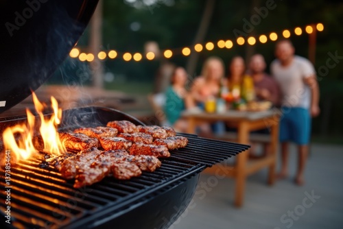 Grill sizzling with meat, surrounded by friends enjoying lively