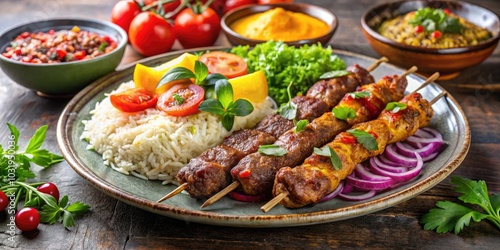 Grilled Adana Kebab Skewers with Aromatic Rice and Fresh Salad - Delicious Turkish Cuisine Presentation for Food Lovers and Culinary Enthusiasts