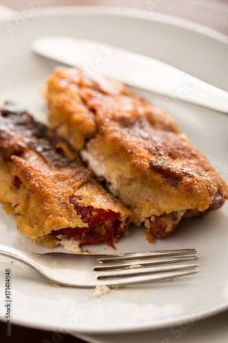 Grilled and fried in eggs paprika with knife and fork on the plate