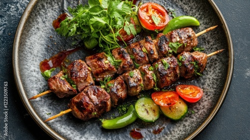 Grilled beef kebab skewers with vegetables and fresh herbs on rustic plate