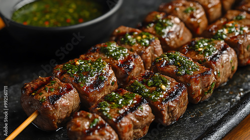 Grilled beef skewers served with a spicy green chili dipping sauce