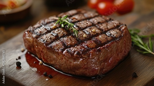 Grilled Beef Steak on Wooden Board Garnished with Rosemary and Spices