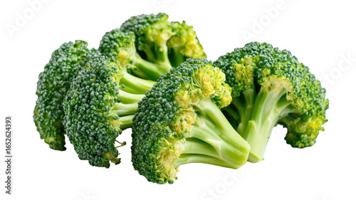 Grilled broccoli florets with charred edges isolated on white background