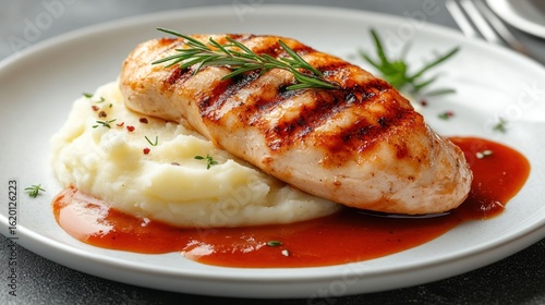Grilled chicken breast atop mashed potatoes, drizzled with sauce