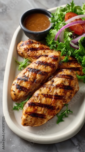 Grilled chicken breasts with fresh vegetable salad and dipping sauce served on a white oval plate for healthy meal presentation and casual dining