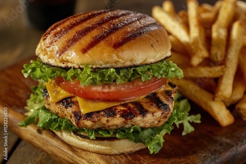 Grilled Chicken Burger with Cheddar and Fries for Ultimate Freshness and Indulgence