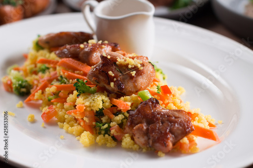 Grilled chicken fillet with vegetables and couscous on wooden table