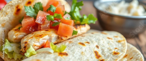 Grilled chicken, pico de gallo, lettuce, cheese in a warm tortilla, mexican, overhead shot