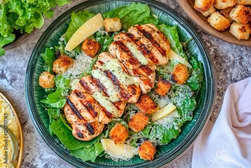 Grilled chicken salad with fresh greens and crispy croutons presented beautifully on a plate