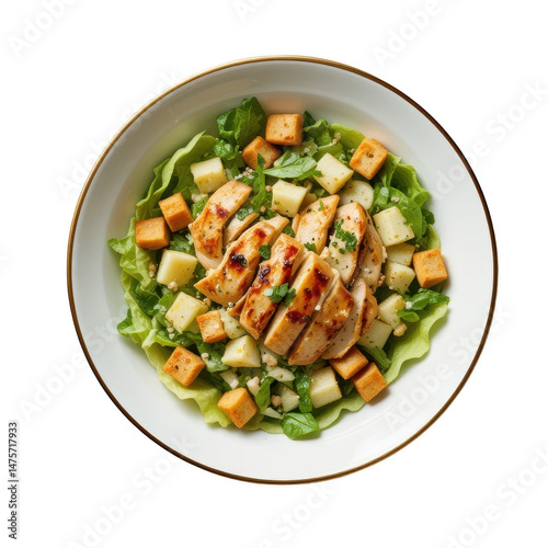 Grilled chicken salad with fresh lettuce, croutons, diced cheese, and herbs served in white bowl, healthy and colorful meal