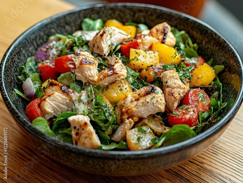 Grilled Chicken Salad with Fresh Vegetables and Herbs in a Bowl