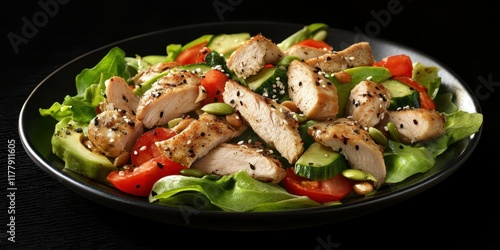 Grilled chicken salad with fresh vegetables and sesame seeds served on a black plate