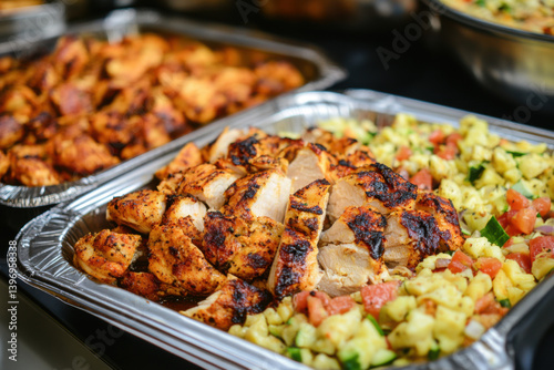Grilled chicken served with fresh vegetable salad at a festive gathering on a summer evening