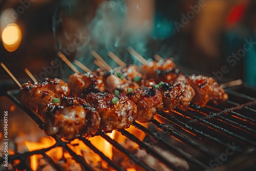 Grilled chicken skewers cooking over hot coals
