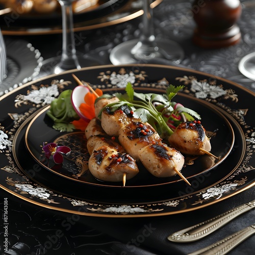 Grilled Chicken Skewers on a Black Plate with Gold Accents
