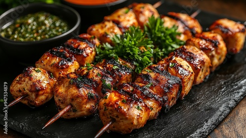 Grilled chicken skewers on a slate plate