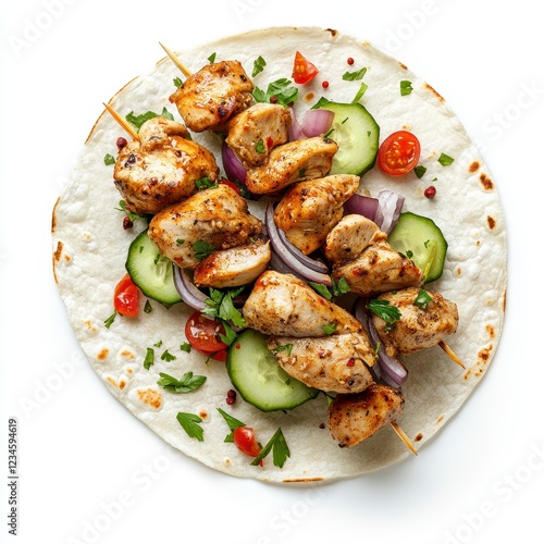Grilled Chicken Skewers on Flatbread with Fresh Vegetables and Herbs