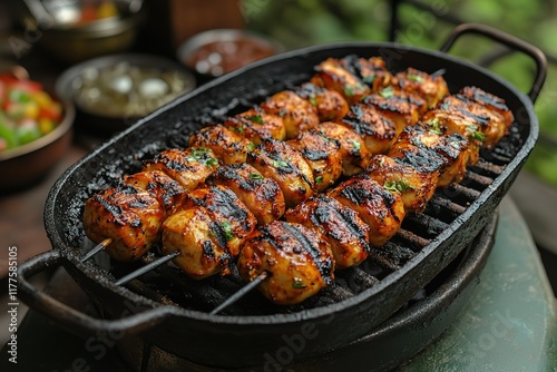 Grilled chicken skewers sizzling on a cast iron grill. Delicious summer BBQ!