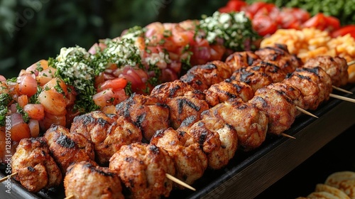 Grilled Chicken Skewers with Fresh Tomato Salad and Veggies a Delicious and Healthy Meal Close Up View