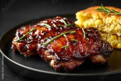 Grilled chicken thighs glazed with sauce, served with cornbread on a black plate.
