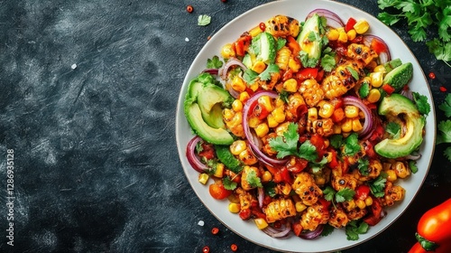 Grilled corn and avocado salad on plate, dark background, fresh herbs, food photography