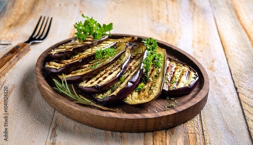 grilled eggplant slices with fresh herbs arranged on a rustic wooden platter