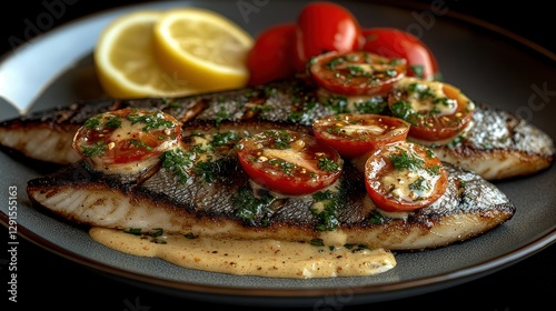 Grilled fish, lemon, tomatoes, sauce, dark background, restaurant menu