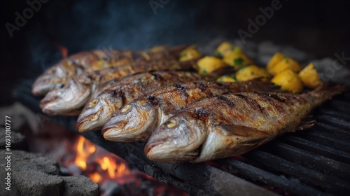 Grilled fish sizzling atop crackling flames, tantalizing aromas evoke a rustic barbecue, reminiscent of midsummer feasts and Basque sagardotegi