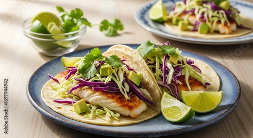 Grilled Fish Tacos with Avocado & Cabbage – Vibrant Blue Plate Flatlay