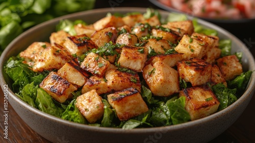 Grilled halloumi salad in a bowl with lettuce.