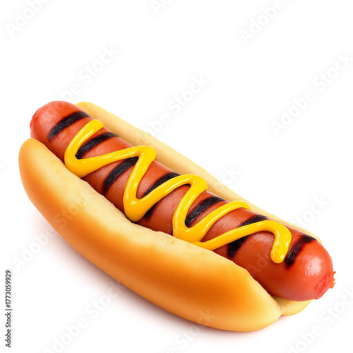 Grilled hot dog in toasted bun with mustard topping vector illustration isolated on white background