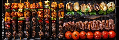 Grilled Lule Kebab, Barbecue Vegetables, Fish on Grill Big Set, Skewered Bbq Minced Meat Mix