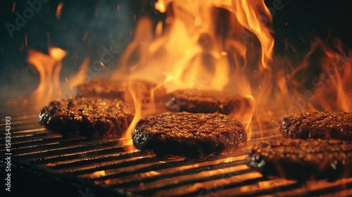 grilled meat patties being cooked on a flaming grill . aspect ratio 16:9