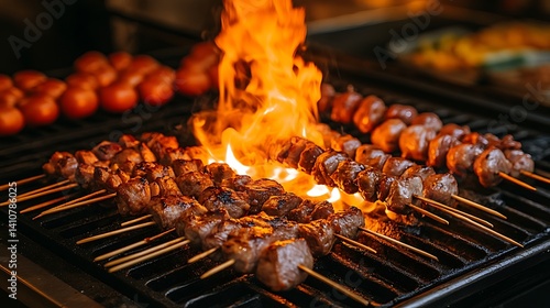 Grilled Meat Skewers on Fire