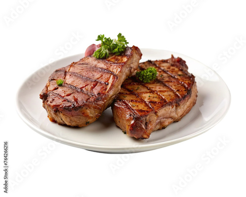 Grilled meat steak on white plate. isolated on transparent background.